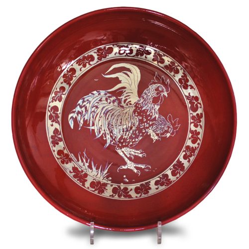 Cockerel coupe plate. Deep red ground. Diameter 35.5cm. Unique number 9086.