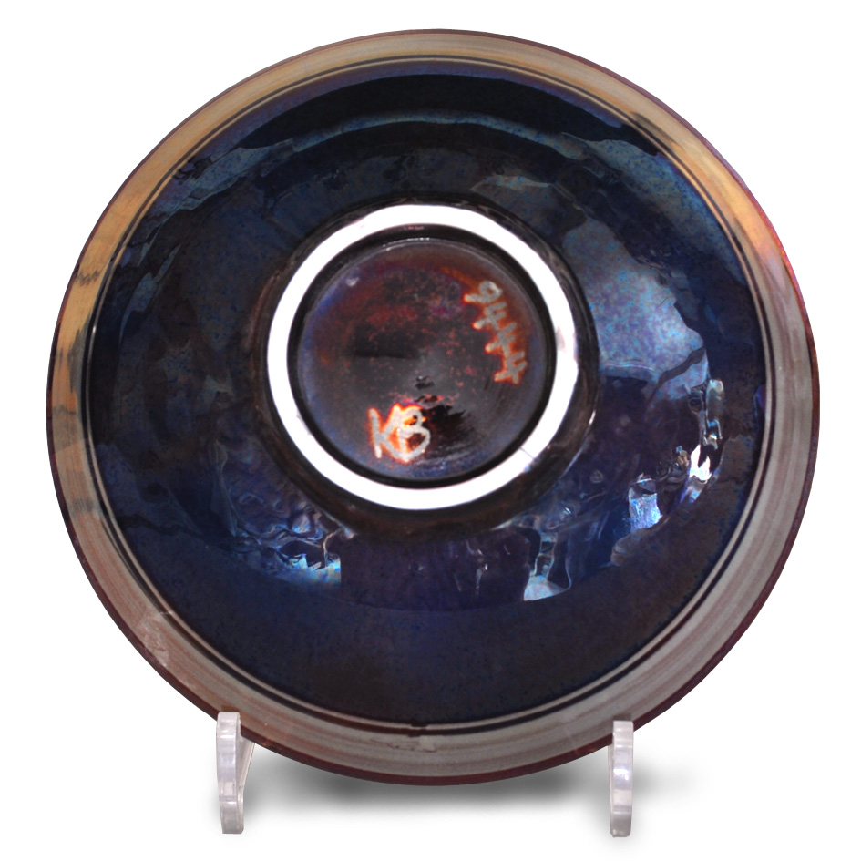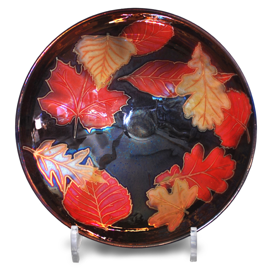Small bowl with autumn leaves decoration. Silver lustre brushwork on purple-blue ground. Diameter 21cm. Signed and numbered.