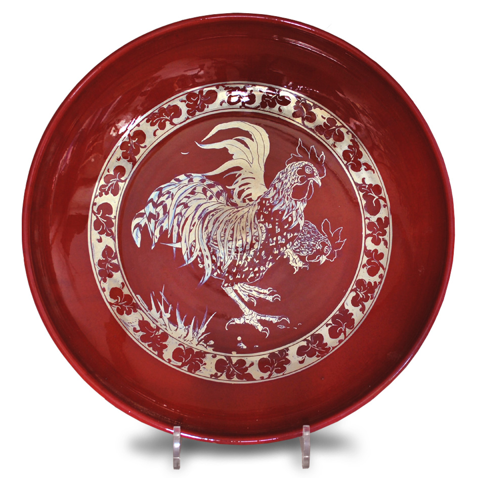 Coupe plate with cockerel decoration. Silver lustre brushwork on deep red ground. Diameter 35.5cm. Signed and numbered.