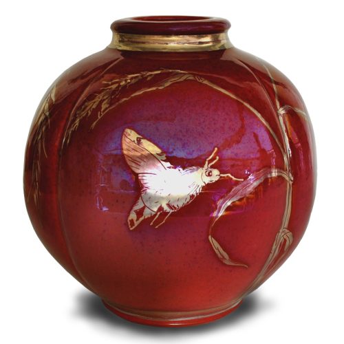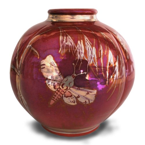 Small bowl with dianthus decoration. Copper and silver lustre brushwork on purple-blue ground. Diameter 17 cm. Signed and numbered.
