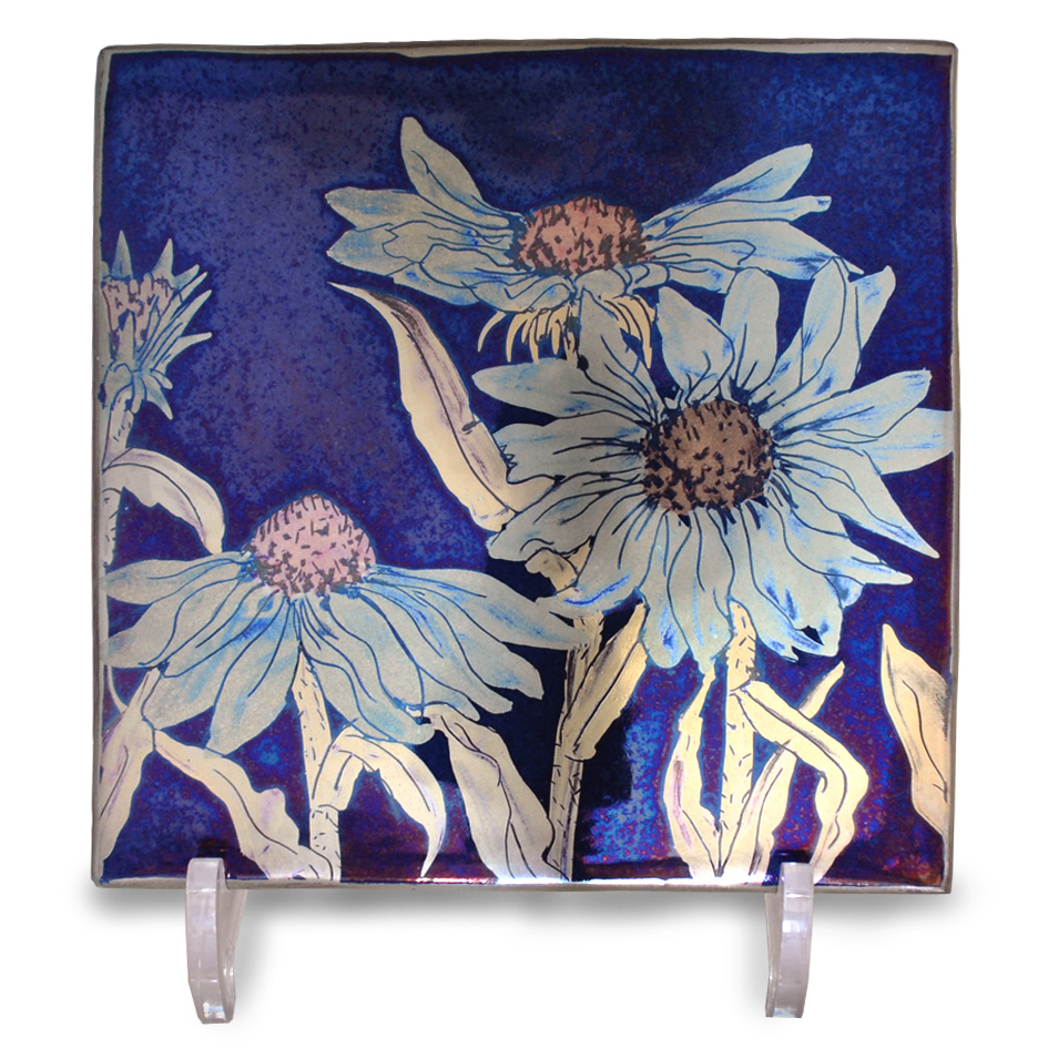 Handmade lustreware vitrified porcelain tile with lustre brushwork. Approx 15cm/ 6 inches square.