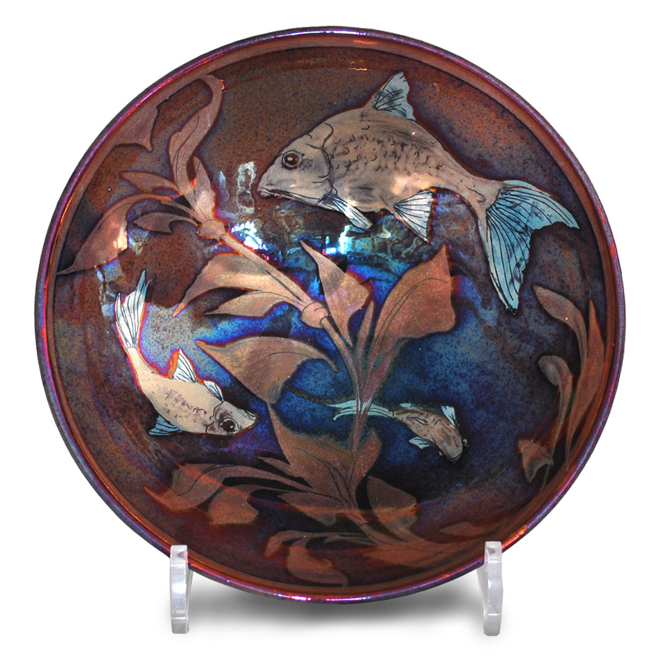 Small bowl with fish and weed decoration. Copper and silver lustre brushwork on purple-blue ground. Diameter 20.5cm. Signed and numbered.