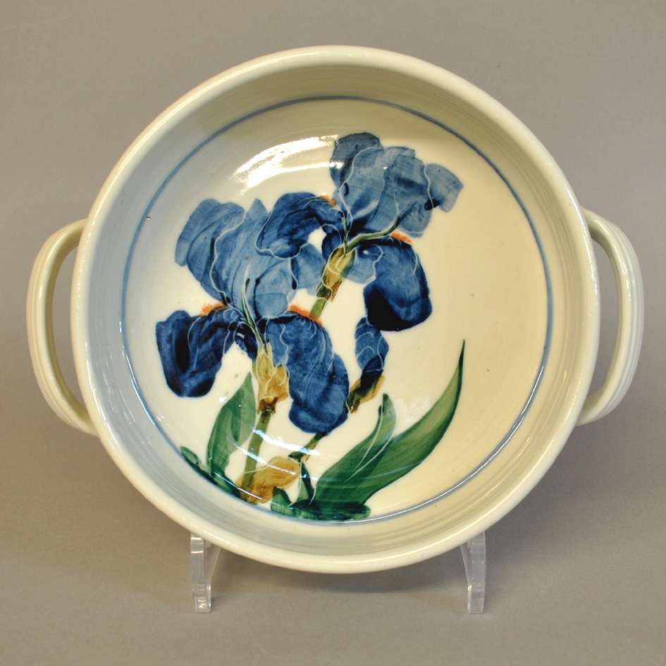 Our small sized dish is good for serving rice or tomato salads; puddings; hot vegetables. The handles make it easy to take out of the oven. After cooking, just soak overnight for easy cleaning or pop it in the dishwasher- it saves a lot of elbow grease. Iris design. Around 19cm/ 7.5 inches in diameter. Each is individually decorated so yours will vary a little from the picture.