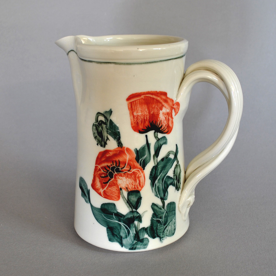 Poppy design handy pint jug for special occasions. They also make useful vases for tulips or a bunch of daffodils. Dishwasher safe. Each is individually decorated so yours will vary a little from the picture.