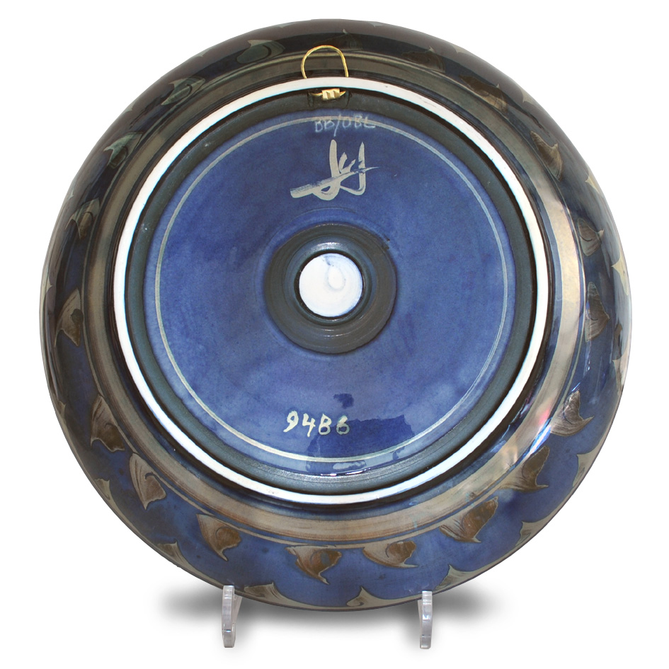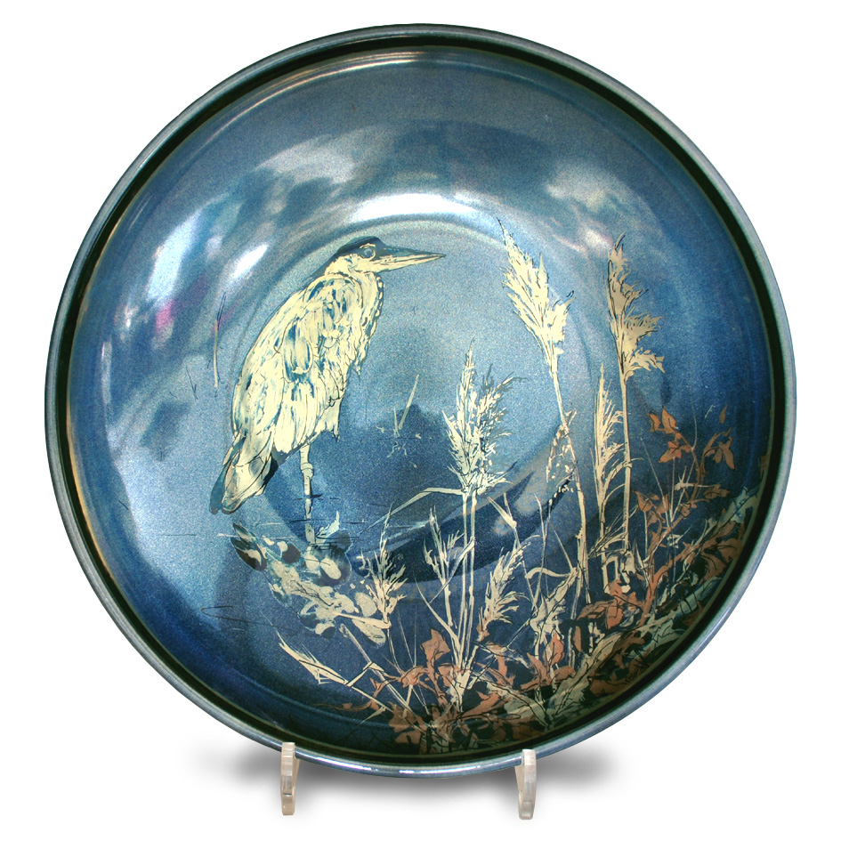 Coupe plate with Heron and reeds decoration. Copper and silver lustre brushwork on blue ground. Diameter 33cm. Signed and numbered.