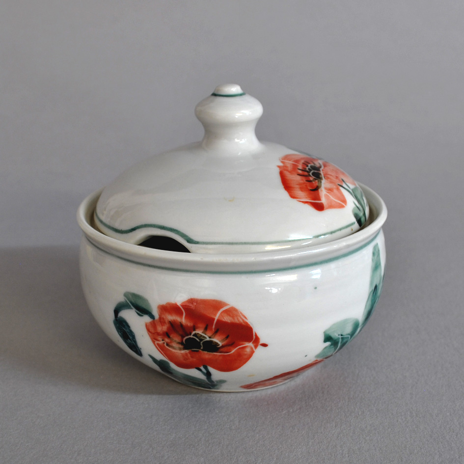 This handthrown sugar bowl includes a small hole to secure a teaspoon, preventing any moisture from affecting your sugar. Poppy design. Each is individually decorated so yours will vary a little from the picture.