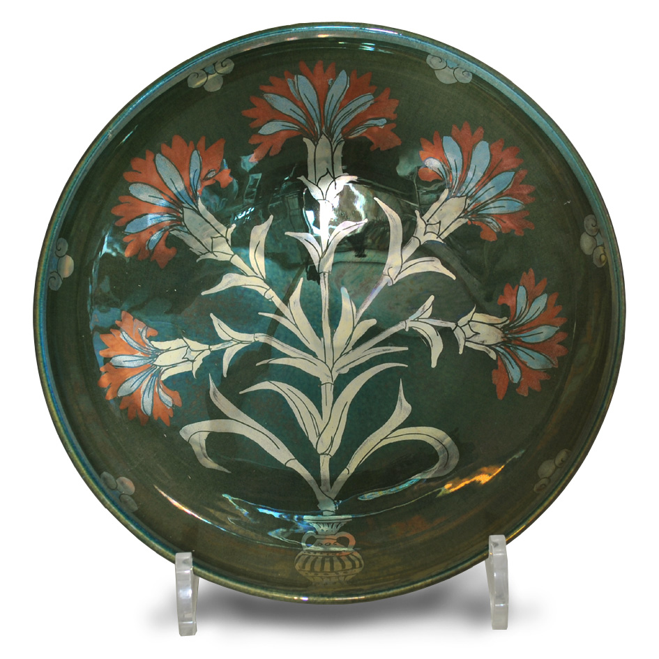 Small bowl with dianthus decoration. Copper and silver lustre brushwork on blue-green ground. Diameter 21cm. Signed and numbered.