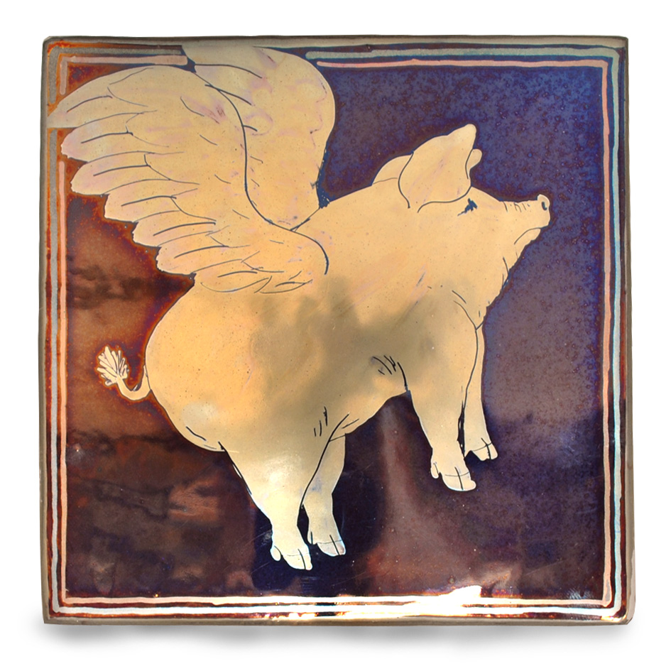 Handmade lustreware vitrified porcelain tile with lustre brushwork. Approx 15cm/ 6 inches square.